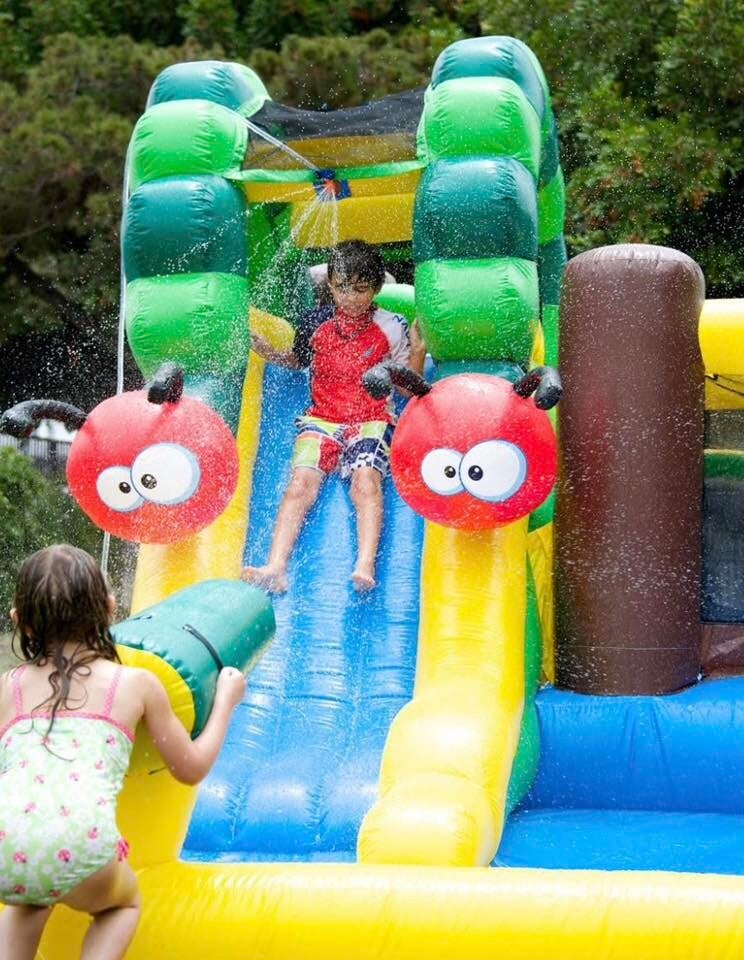 Showcases a 5x5 bounce area, water sprinkle system above the slide & also on a water canon blaster, basketball hoop, 5ft long slide and large 10ft splash pool.